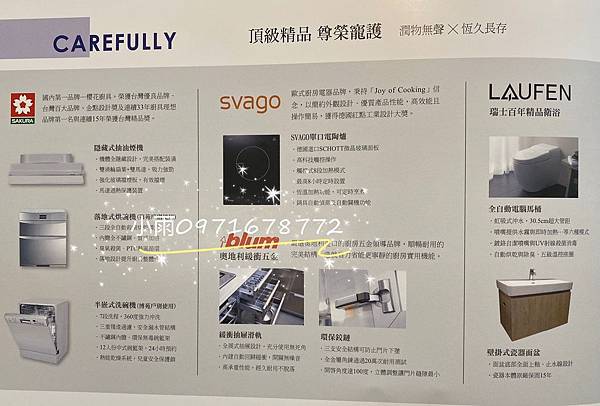 產品建材:各戶玄關大門鑄鋁鋼木門,三合一高級電子鎖,8mm以上等級強化玻璃,80X80mm的拋光石英磚,櫻花排油煙機、落第半崁式洗碗機,廚具櫃子皆設進口緩衝系統